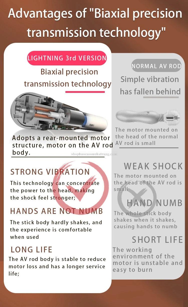 | Đặc điểm | Trang bị motor công suất cao, tạo ra lực rung sâu và mạnh mẽ. silicone y tế cao cấp, cực kỳ êm ái, thân thiện với da và có thể uốn cong linh hoạt 180 độ. Với 3 mức cường độ rung và 7 chế độ rung khác nhau |